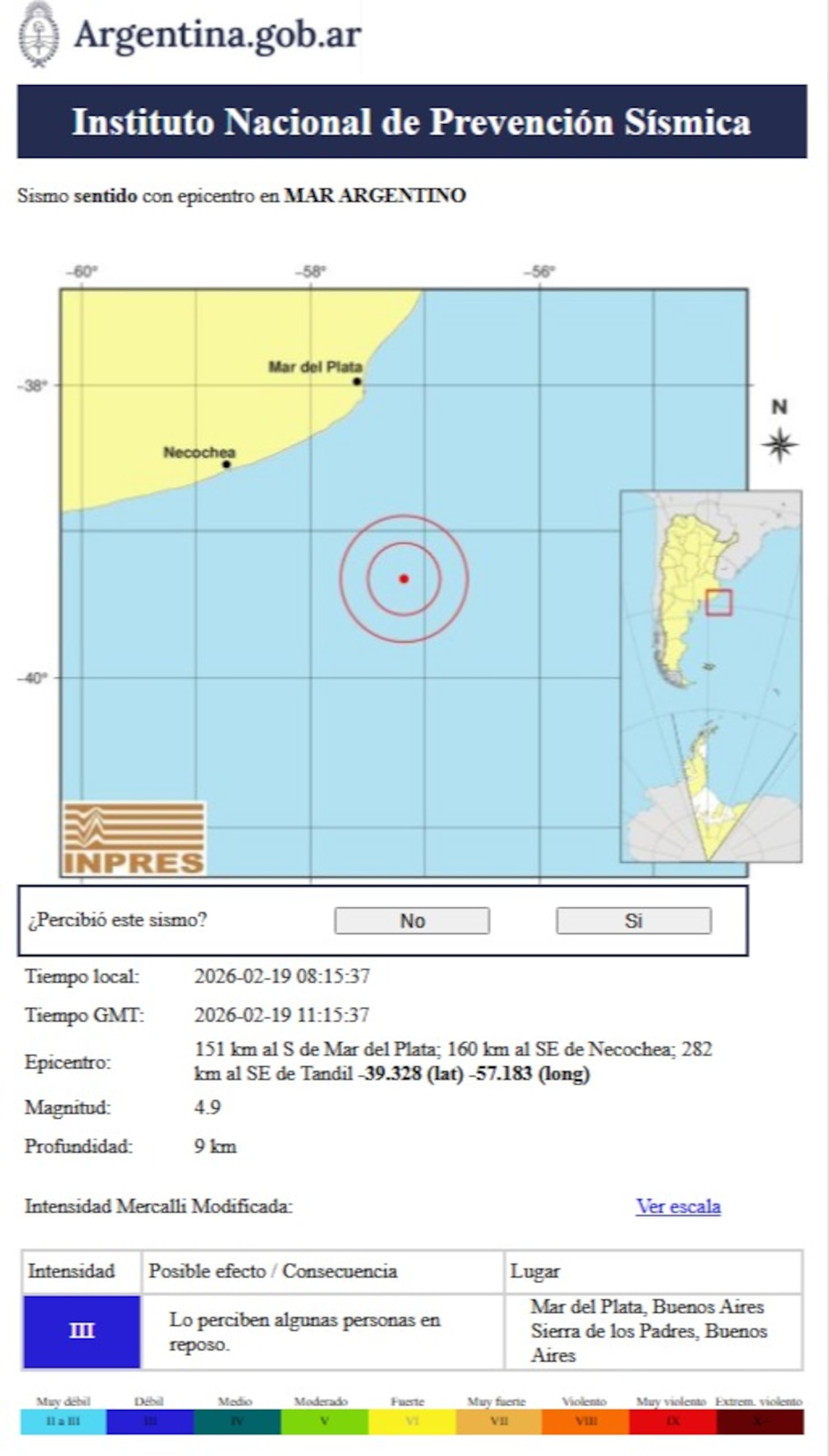 08.15 frente a la costa atlántica, con epicentro bajo el mar y a 151 kilómetros